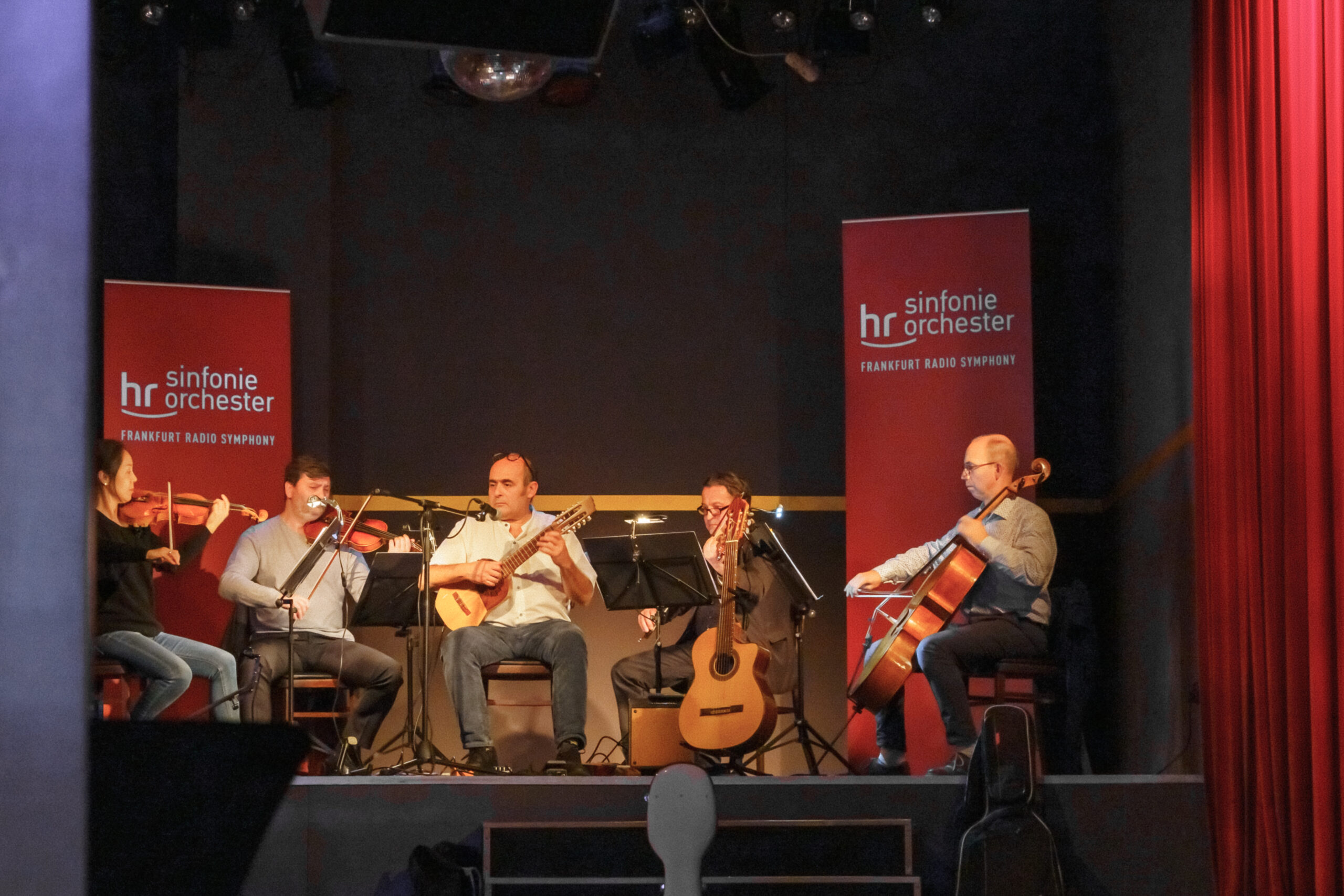 Neben einer professionellen Musikanlage gibt es auch eine große Bühne mit rotem Vorhang und Theaterbeleuchtung.