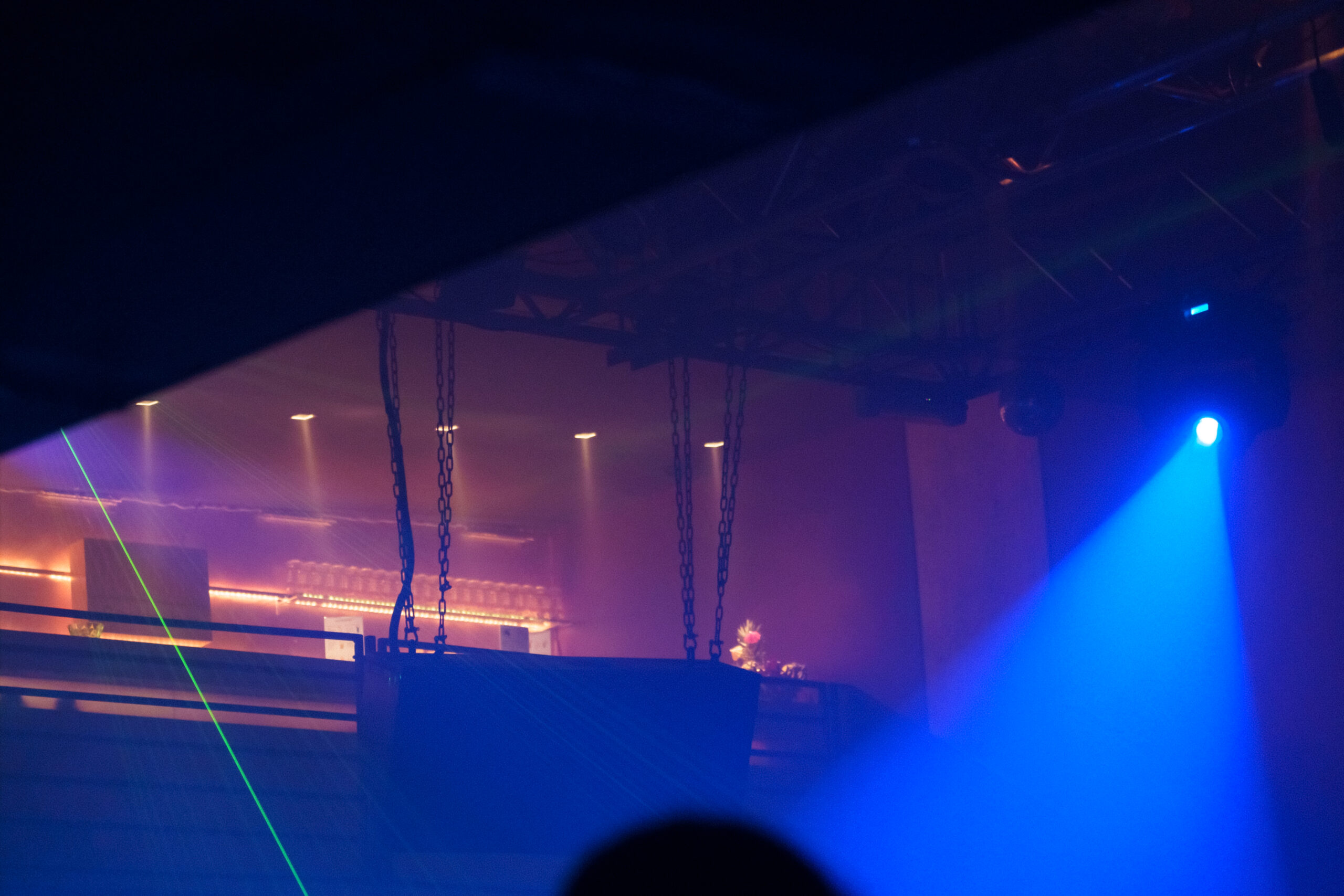 Hauptraum mit DJ-Pult, Tanzfläche, Bühne und Barbereich